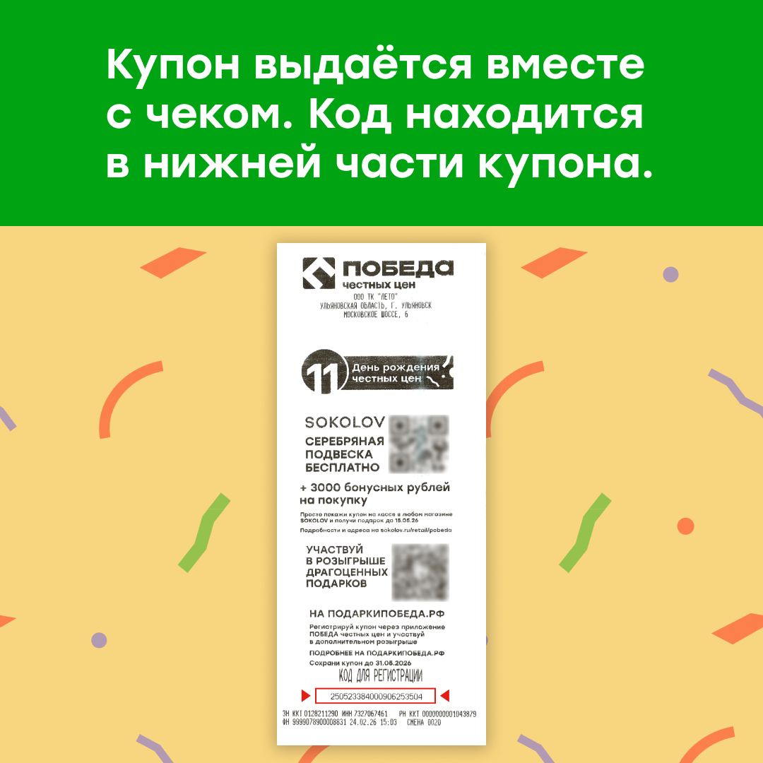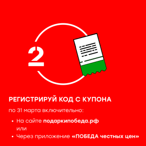 Чтобы принять участие в акции, необходимо приобрести любое количество товара в одном чеке на сумму от 1000 рублей (без учета табака и алкогольной продукции) в торговой сети ПОБЕДА в период 27 февраля 2026 года по 31 марта 2026 года включительно. Зарегистрировать код с купона на сайте Сайте Акции в период 27 февраля 2026 года по 31 марта 2026 года включительно.